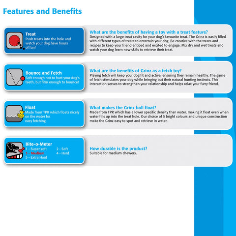 - Bounce and Fetch Toy: The Grinz Fetch Ball is crafted to be soft enough not to harm your dog's teeth, yet firm enough to provide a satisfying bounce that encourages active play