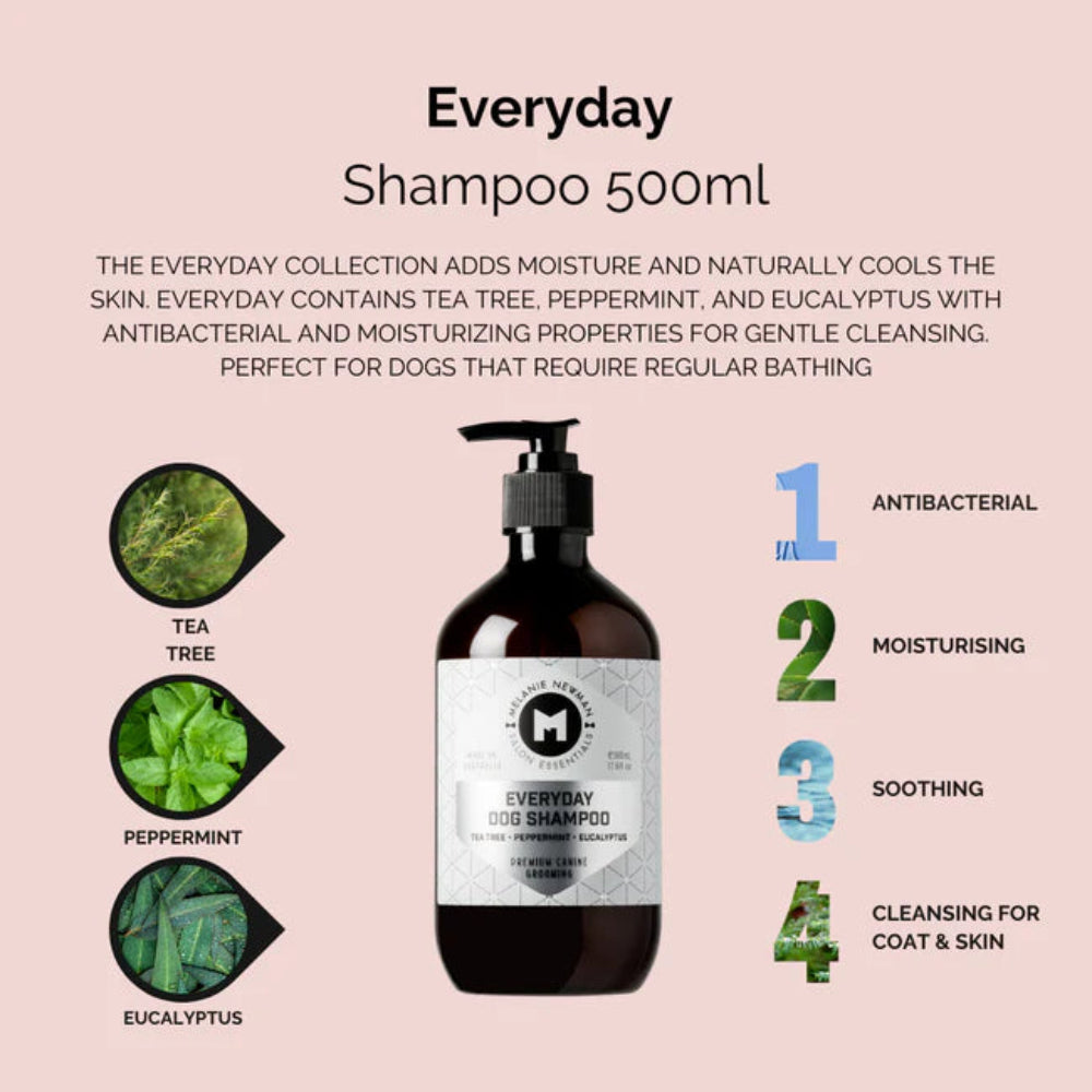 Enriched with vitamin-enriched conditioning oils and essential oils of Tea Tree, Peppermint, and Eucalyptus, our Everyday Shampoo provides a clean, fresh-smelling coat with a natural shine. Free from harsh synthetic chemicals, it's the ideal choice for both professional groomers and at-home groomers who desire a professional finish.