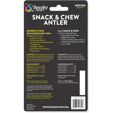 It's a two-for-one deal with this Snack & Chew Antler from Spunky Pup! Dogs will love the rugged nylon chew, plus they'll be rewarded with a delicious embedded, beef-flavoured treat made from potato starch and rice flour.