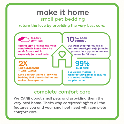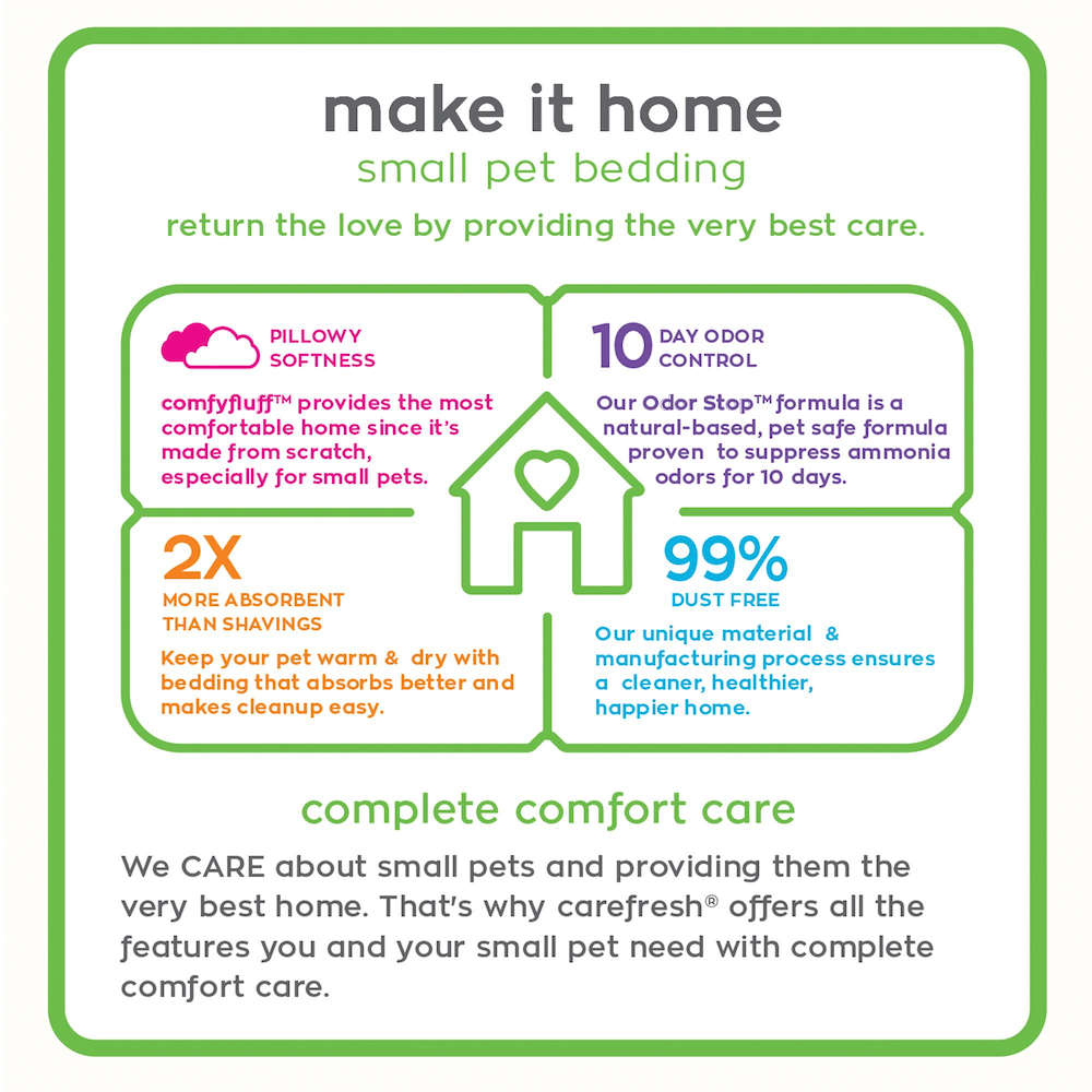 Made from reclaimed paper fibres, Carefresh litter absorbs three times more liquid than wood shavings, is virtually dust-free, and is made for small mammals special needs. Plus, Carefreshs proprietary Odour Stop formula has been proven in independent laboratory tests to suppress ammonia odour for 10 days – 40% longer than other leading brands!